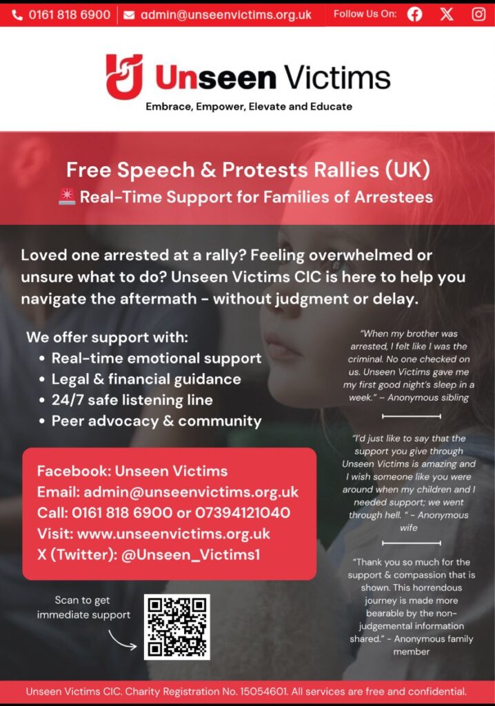 Unseen Victims CIC has launched a dedicated support initiative for families whose loved ones are arrested during free speech demonstrations and protest rallies across the UK. With over 200 individuals supported so far this year alone, the CIC is working tirelessly to ensure no family is left isolated during one of the most frightening and uncertain times they may ever face.